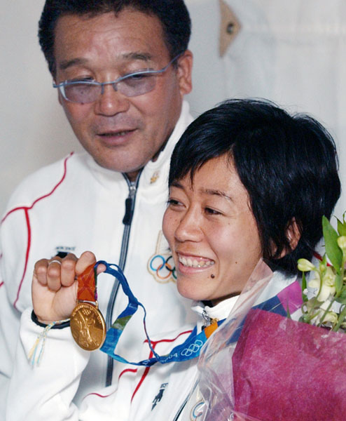 世界の頂点に立って笑顔の野口みずき(右)と藤田信之氏(C)共同通信社
