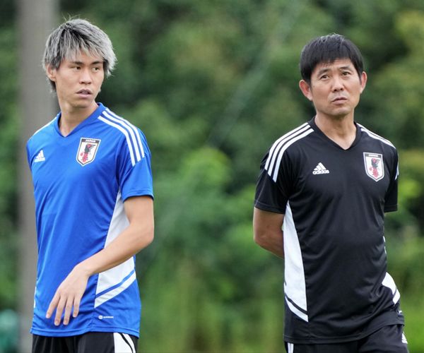 韓国戦に向け前日練習をおこなう橋本拳人(左)と森保監督(C)Norio ROKUKAWA/Office La Strada