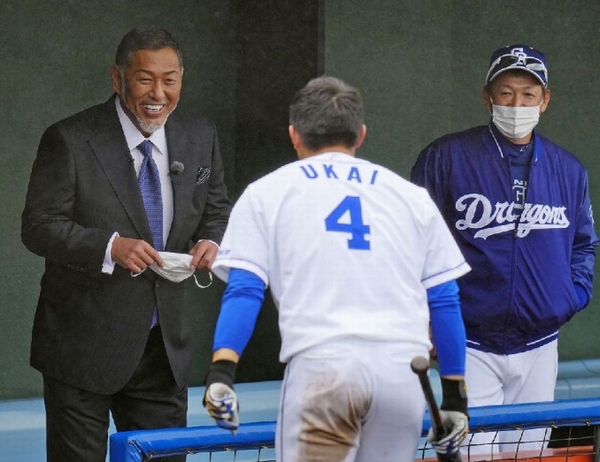 中日キャンプを訪問し、鵜飼(4)にアドバイスする清原和博氏。右は立浪監督(C)共同通信社