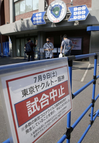 試合中止は一軍だけじゃなかった(9日、ヤクルト対阪神戦が中止となったことを知らせる掲示=神宮球場)/(C)共同通信社