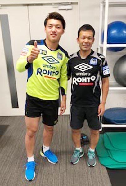 ロッカールームで堂安(左)と2ショット(鴨川さん提供)
