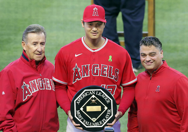 期限1分まで気が抜けない!(大谷を囲むエ軍のモレノ・オーナーとミナシアンGM)/(C)共同通信社