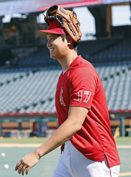 気分も落ち着いた?試合前、笑顔でグラウンドに出る大谷(=3日)/(C)共同通信社