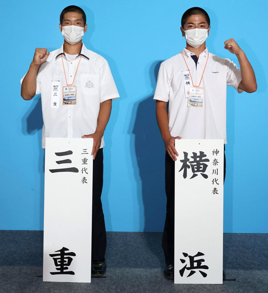 対戦が決まりガッツポーズする、三重の宇佐美貴也主将と横浜の玉城陽希主将(代表撮影)