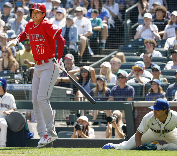 8日のマリナーズ戦の三回、相手先発左腕ゴンザレスと交錯して左足を踏まれた大谷(C)共同通信社