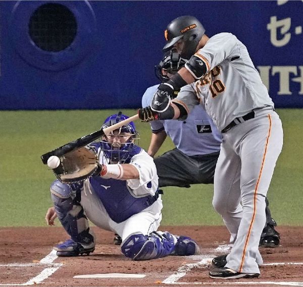 1回巨人2死三塁、中田翔が中前に先制打。=バンテリンドーム(C)共同通信社