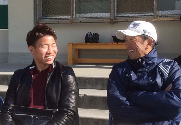 母校を訪れた浅野とツーショット(本人提供)