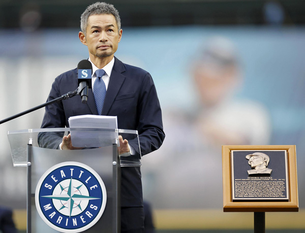 英語によるスピーチで球場を沸かせたイチローさん(C)ゲッティ=共同
