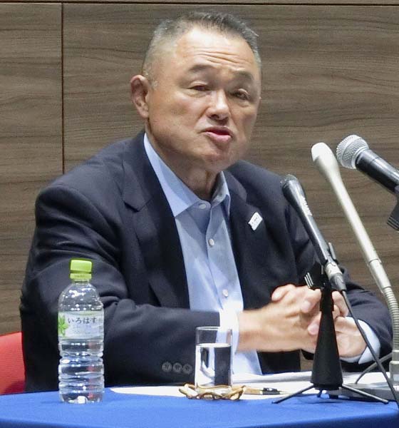 定例の記者会見をするJOCの山下泰裕会長(C)共同通信社