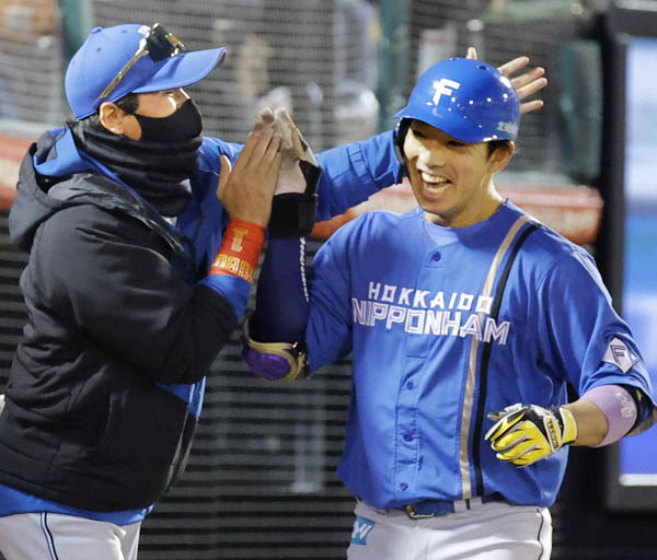 正捕手に最も近い宇佐見(左は新庄監督)/(C)共同通信社