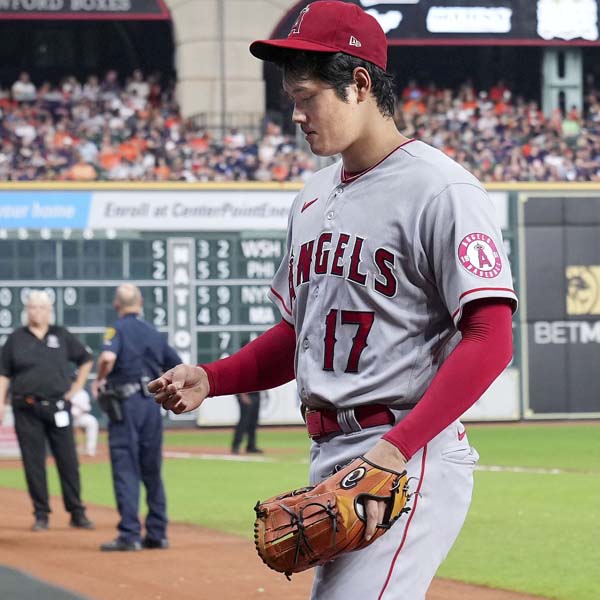 アストロズ戦の6回前に投球練習をした後、右手中指のマメで降板した大谷(C)共同通信社