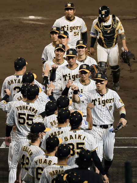 12日、中日に勝利し喜ぶ阪神ナイン(C)共同通信社