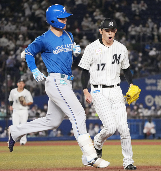 清宮(左)を投ゴロに打ち取った佐々木朗希(C)共同通信社