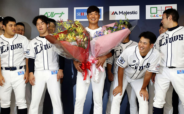引退会見で花束を手に笑顔を見せる内海(C)共同通信社
