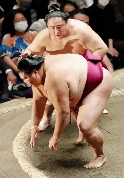 佐田の海(上)が突き落としで御嶽海を破る(C)共同通信社