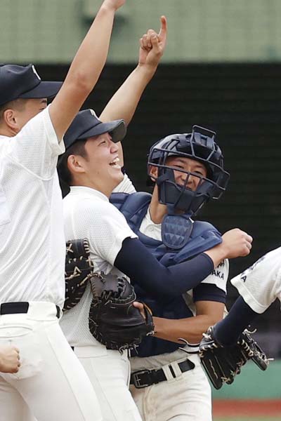 聖光学院を破り国体優勝、抱き合って喜ぶ大阪桐蔭・松尾(右)と川原(C)共同通信社