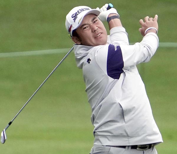 プロアマ戦でショットを放ち、痛みに顔をしかめる松山(C)共同通信社
