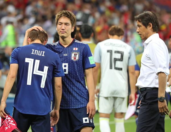 ベルギー戦後に乾(14番)を慰める原口。右は落胆する西野監督(C)Norio ROKUKAWA/office La Strada