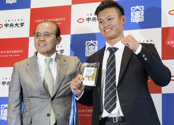岡田監督(左)から指名挨拶を受ける森下(C)共同通信社