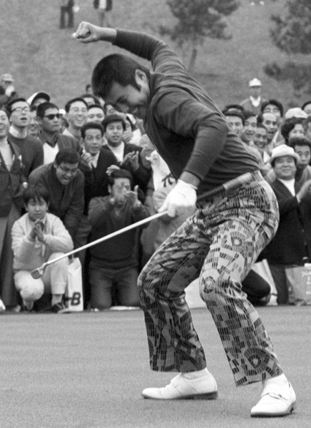 1972年の日本シリーズ最終日、プレーオフで杉原輝雄を破り、ガッツポーズで喜ぶ尾崎将司(C)共同通信社