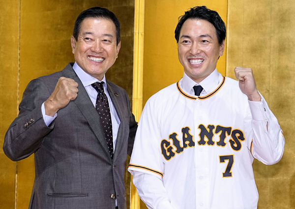 背番号「7」に袖を通して笑顔の長野と原監督(C)共同通信社