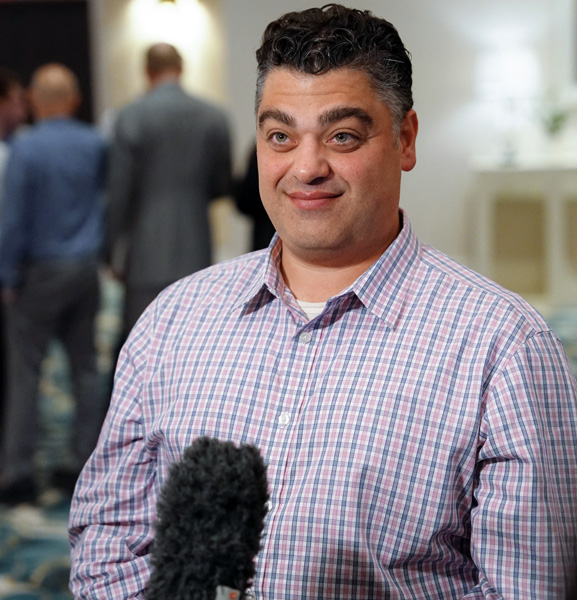 自信満々に記者団に応えるミナシアンGM(C)ロイター/USA TODAY Sports