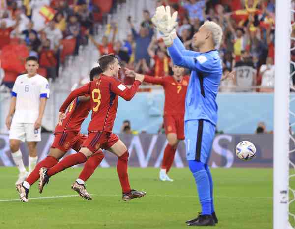チーム5点目のゴールを決めたスペインのガビ(9)。手前はGKナバス(C)ゲッティ=共同