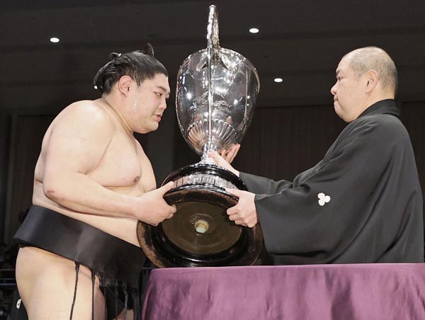 八角理事量から賜杯を受け取る阿炎(代表撮影)