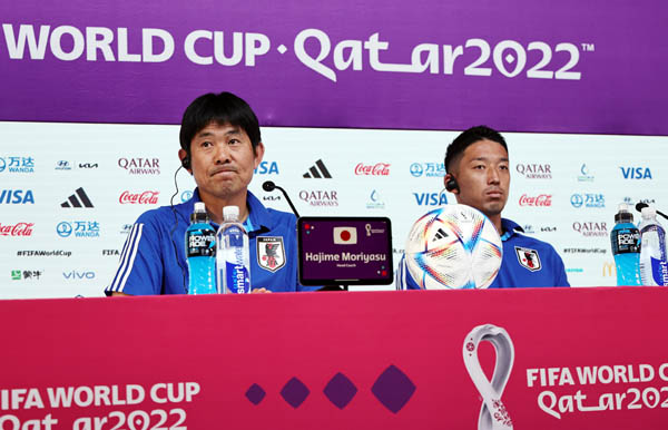 前日会見に臨む森保監督(左)とGK権田(C)Norio ROKUKAWA / offive La Strada