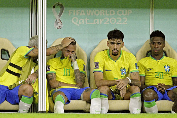セルビア戦で途中交代し、ベンチで涙ぐむネイマール(左2)/(C)ゲッティ=共同