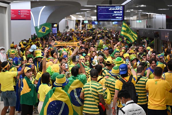 試合前に地下鉄の駅のホームで気勢を上げるブラジルサポーター(C)DPA/共同通信イメージズ