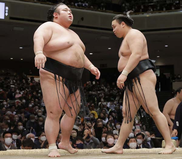 霧馬山(右)に負け、3敗に後退した貴景勝(C)共同通信社