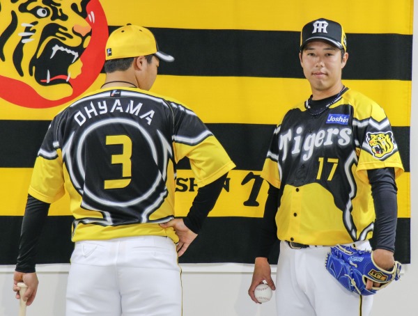 サードユニホームを披露する阪神の青柳(右)と大山(C)共同通信社