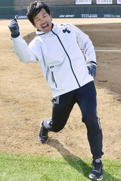 G球場で「熱男」のポーズを見せる松田(C)共同通信社
