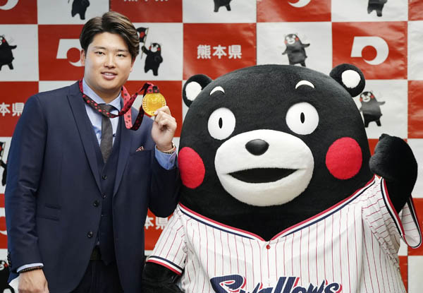 くまモンとポーズを取る村上(C)共同通信社