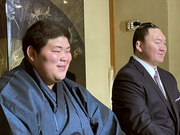 1場所で十両昇進の落合(左)と元白鵬・宮城野親方(日本相撲協会提供)