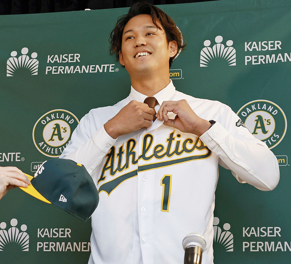 この笑顔!(米アスレチックス入団会見の藤浪)/(C)共同通信社