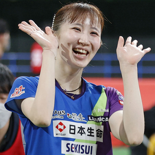 3年ぶり2度目の優勝を決め、笑顔の早田(C)共同通信社