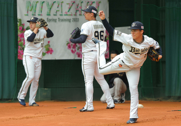 ブルペンで投げ込むオリックスのWBC組(左から宮城、宇田川、山本)/(C)日刊ゲンダイ
