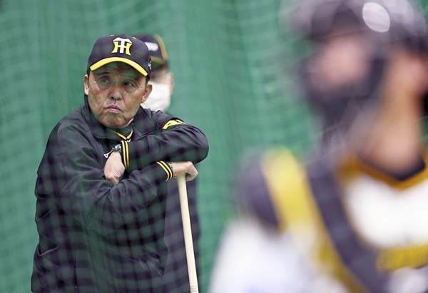 投球練習を見守る阪神・岡田監督(C)共同通信社