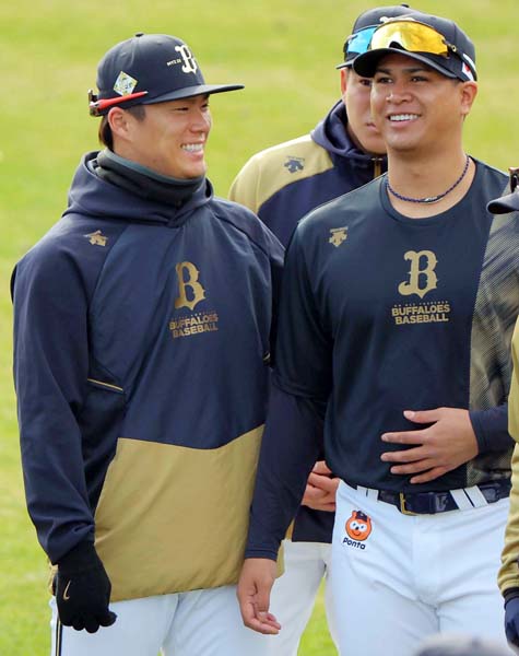 宇田川(右)と話す山本由伸(C)日刊ゲンダイ