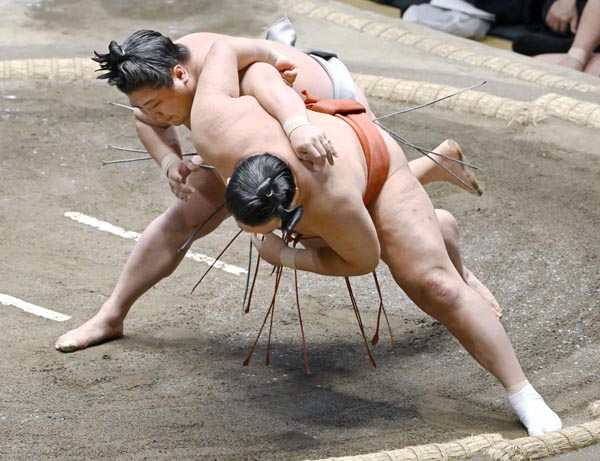 初場所の関脇同士の対戦は若貴景(左)が豊昇龍をすくい投げで下した(C)共同通信社