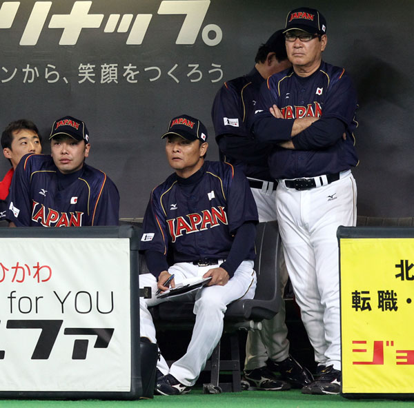 ベンチでは相手の情報をまとめた紙の資料だけが頼りだった(右から山本浩二監督、本人、阿部慎之助捕手)/(C)日刊ゲンダイ