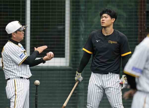 水口打撃コーチ(左)からアドバイスを聞く阪神・佐藤輝明(C)共同通信社