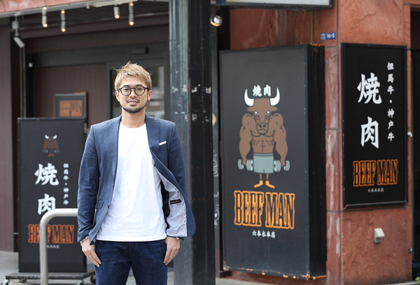 のちにオープンした焼き肉店「BEEFMAN」の前で、橋本太郎氏(本人提供)