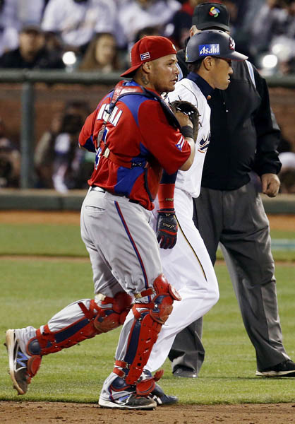 プエルトリコ戦の八回、モリーナ捕手(手前)にタッチされる内川(C)共同通信社