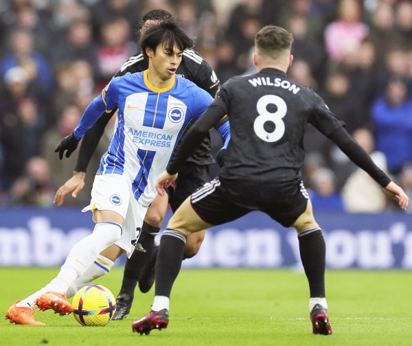 フラム戦の前半、競り合うブライトンの三笘(C)共同通信社
