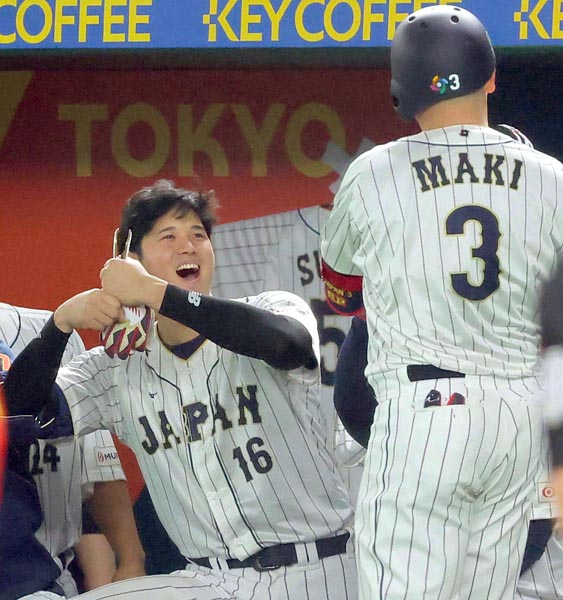 本塁打の牧を笑顔で迎える大谷(C)日刊ゲンダイ
