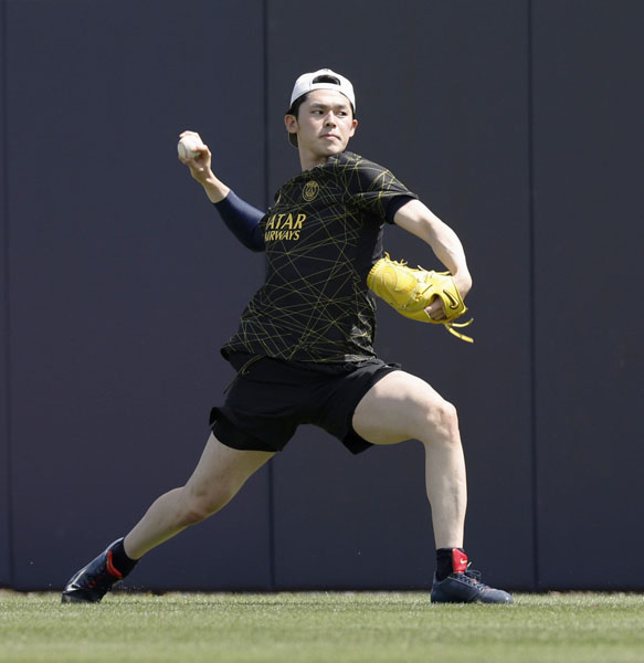 マイアミに到着。キャッチボールで調整するWBC日本代表の佐々木朗希(C)共同通信社