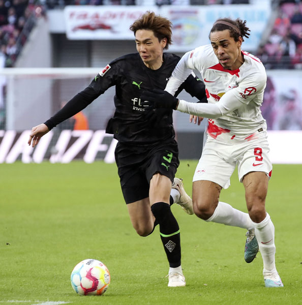 ライプチヒ選手とマッチアップする板倉(C)共同通信社